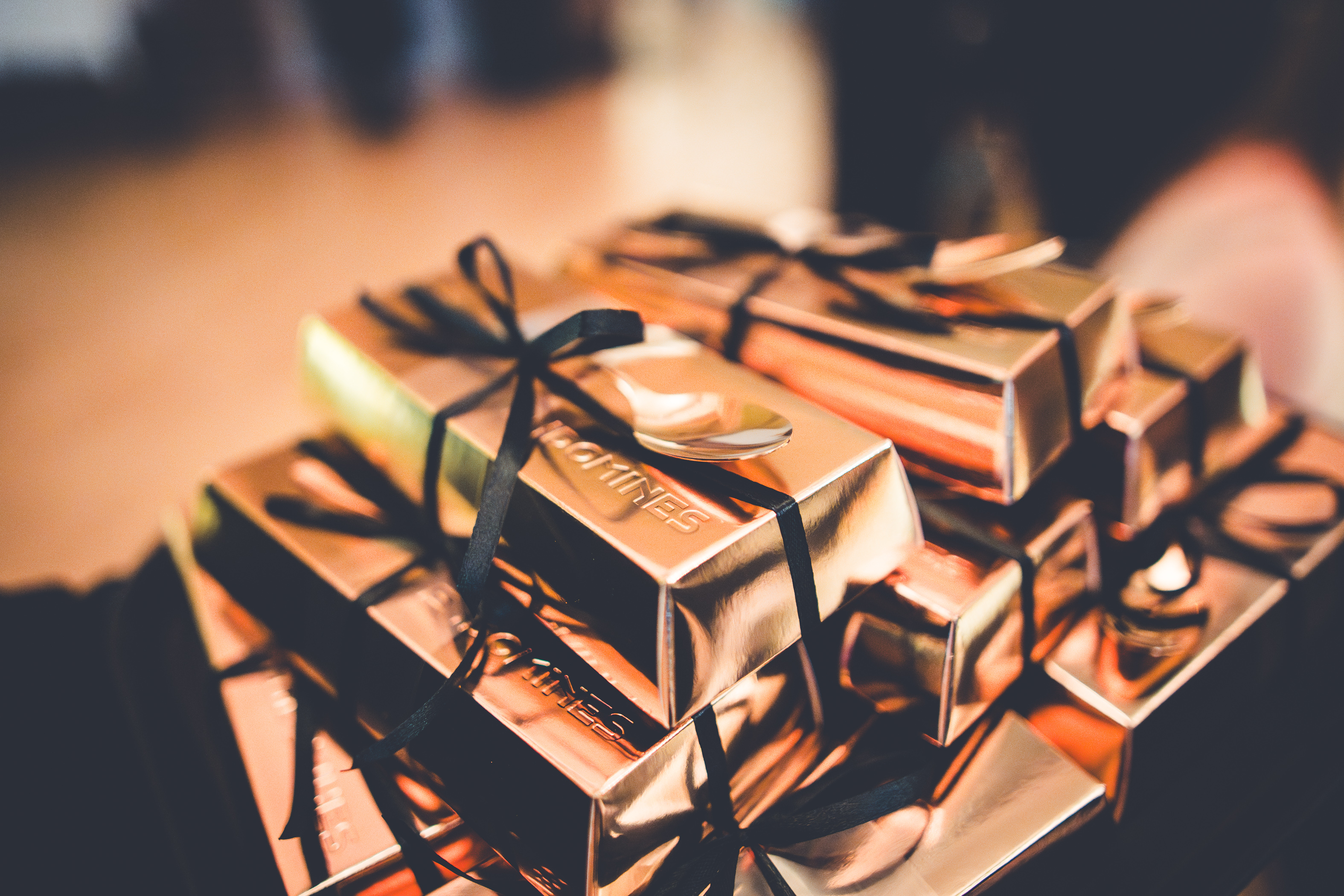 At the close of dinner, each guest received a small gold bar – a cardboard version that revealed chocolate gold coins inside, topped with a golden spoon. Everyone thus enjoyed their own “born with a golden spoon” moment, and one lucky guest received a genuine gold spoon made from Pampalo gold.